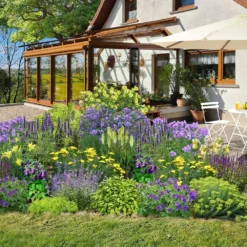 Das Gartenjahr startet zunächst mit den entzückenden Blüten einer Nelkenwurz. Im Wonnemonat Mai schließen sich eine duftende hohe Bartiris, violettes Teppichseifenkraut sowie lange blühender Ziersalbei an. Ein rosa Sonnenröschen bildet dazu ein blütenreiches Kissen an der Beetkante, das bis in den August hinein für Farbe sorgt. Kommt der Juni beginnt die Englische Rose zu blühen, zu der sich im Beethintergrund eine elegante weiße Kugeldistel gesellt, die für tolle Akzente sorgt. Die filigrane Mazedonische Witwenblume schmiegt sich dann ebenso gefällig in das Ensemble wie eine dauerblühende Prachtkerze. Weißer Lavendel, würziger Steinquendel und Teppichthymian verwöhnen die Nase, während Fackellilie und changierender Scheinsonnenhut über Wochen für exotisches Flair sorgen und ganz nebenbei als fulminante Bienen-, Hummel- und Schmetterlingsweide dienen. Den Abschluss des Blütenreigens bildet eine weiße Fetthenne, die im Spätsommer noch einmal zum Nektarhotspot avanciert. Abgerundet wird das Beet durch zwei Federgräser, die sich sanft im Sommerwind wiegen und für den ultimativen mediterranen Touch sorgen. Wer will da noch auf Reisen gehen?