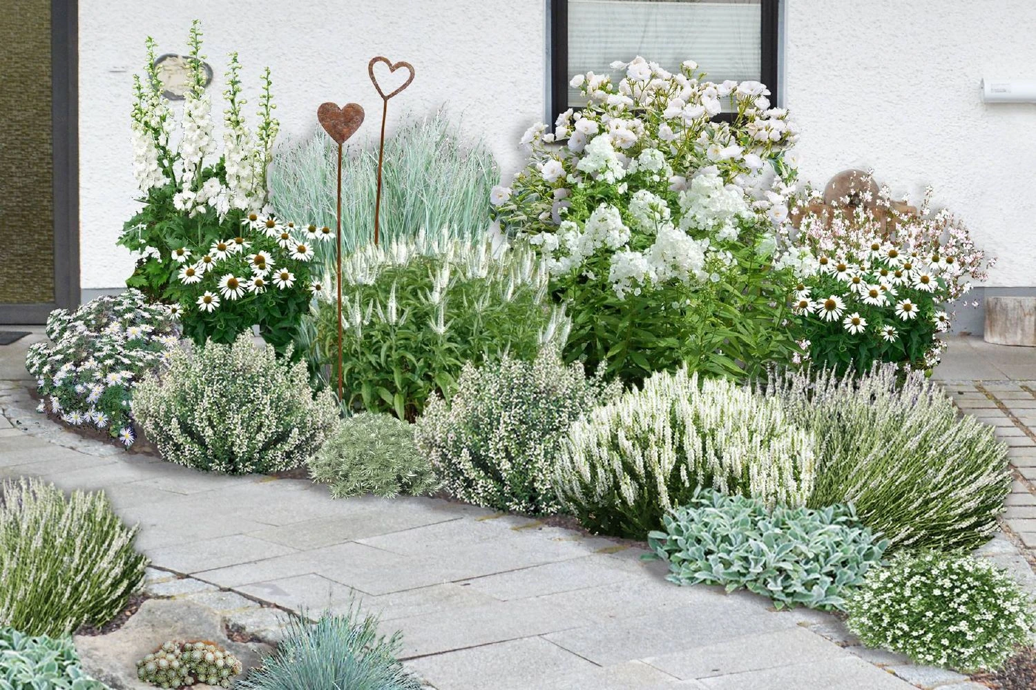 Ein dreieckiges Beet, das den Weg zum Haus von der Auffahrt trennt, dient als perfekte Leinwand für das Zeppelin-Beetpaket ‚Brautzauber‘. Diese Ton-in-Ton-Komposition ganz in Weiß und Silbergrau sorgt für einen frisch-eleganten Anblick und begrüßt jeden, der an ihm vorbeigeht, mit einem blütenreichen Lächeln. Von Mai bis weit in den Oktober hinein erfreut dabei eine herrliche Auswahl an Blattschmuck- und Blütenstauden. Der Star des Ensembles ist jedoch eine duftende, öfterblühende Strauchrose, die von Juni bis in den Herbst hinein fleißig ihre weiße Pracht zur Schau stellt. Umgeben wird sie von üppigen Staudenvertretern wie Rittersporn, Hoher Flammenblume, Ehrenpreis, Prachtkerze und weißem Scheinsonnenhut.