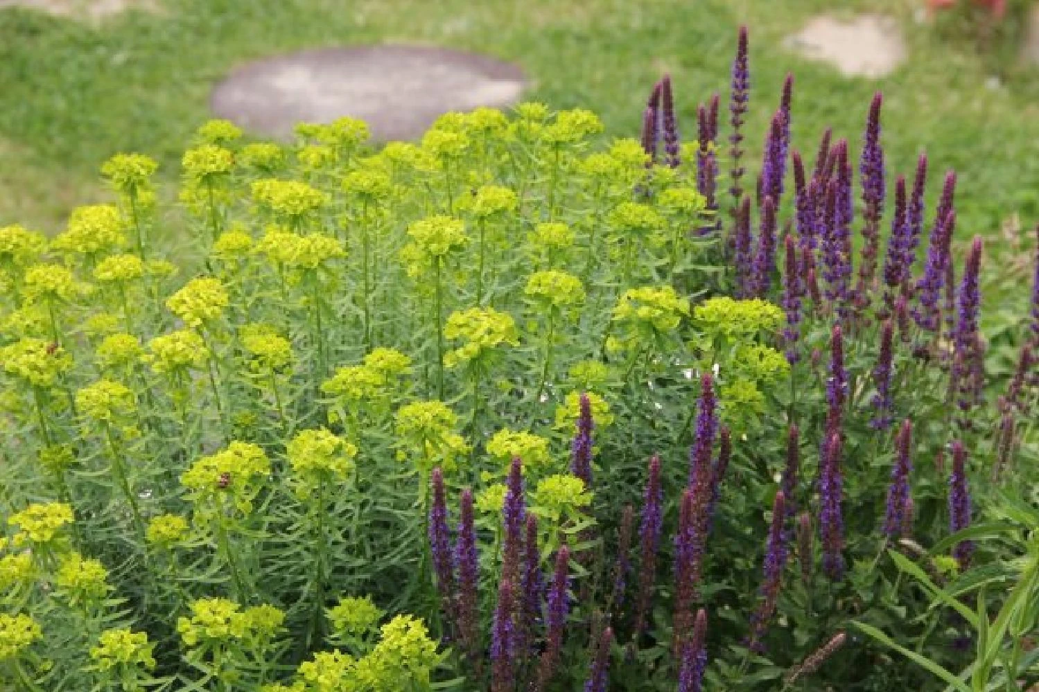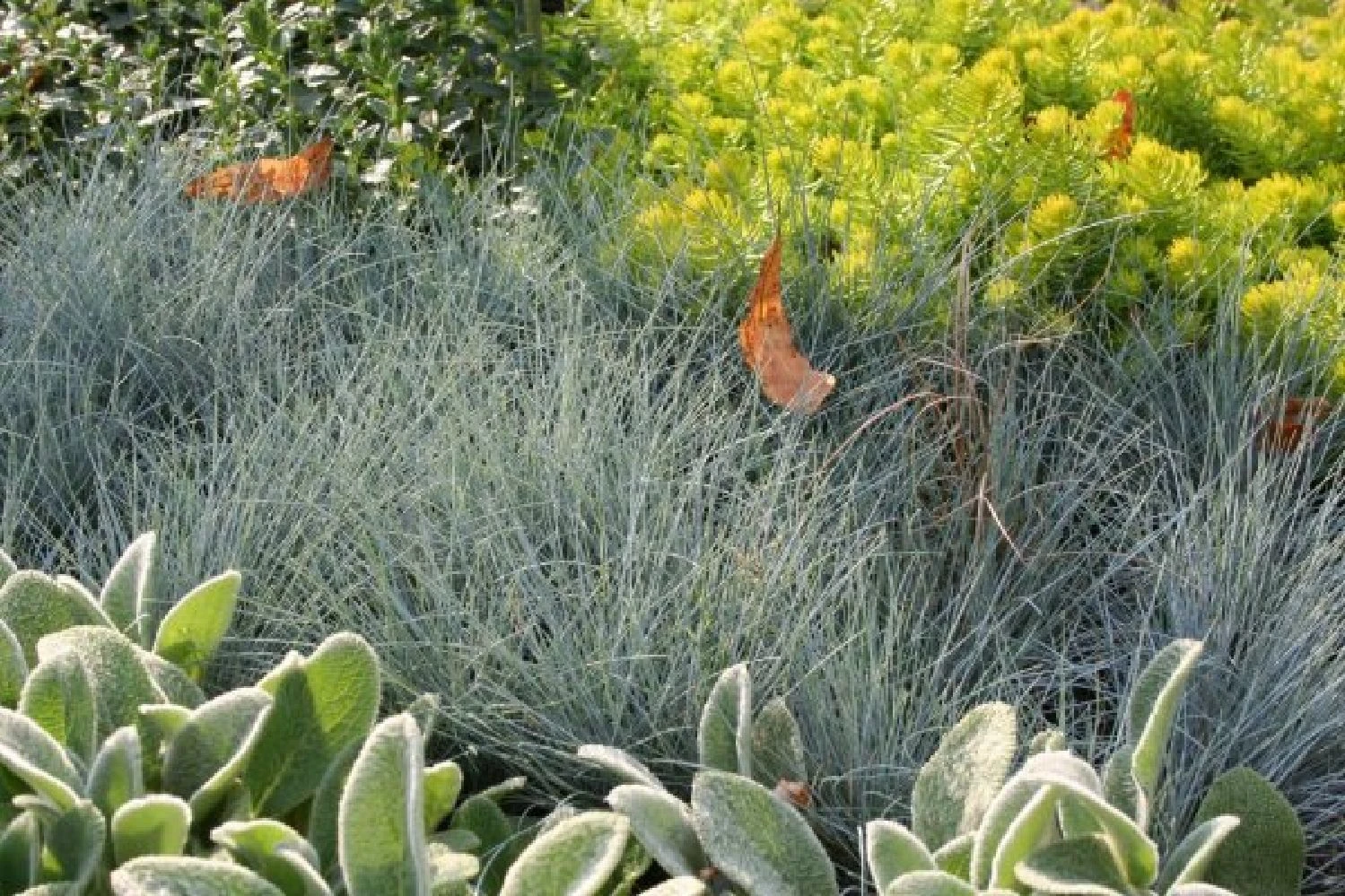 Hierfür bestens geeignet sind Polsterstauden wie Teppich-Glockenblumen, -Thymian, -Kamille und – Schleierkraut. Dazu Wollziest mit silbrigem Laub, weiches Federhaargras und Blauschwingel. Niedriger Ziersalbei sorgt für hübsche kerzenförmige Blüten, während Katzenminze duftig blaue Schleier bildet. Mediterrane Halbsträucher wie Lavendel und Heiligenkraut verströmen darüber hinaus in der Sommersonne ihre ätherischen Öle und sorgen auch im Winter für Struktur im Beet. Ein Star des Hangensembles ist die Steppenwolfsmilch mit ihren limettengrünen Blütenständen, die üppige, halbkugelförmige Büsche bildet und so für tolle Akzente sorgt. Zart und leicht webt sich als zierliche Krönung die karminrote Karthäusernelke in die Pflanzengemeinschaft und besticht mit ihren schwebenden Blütchen.