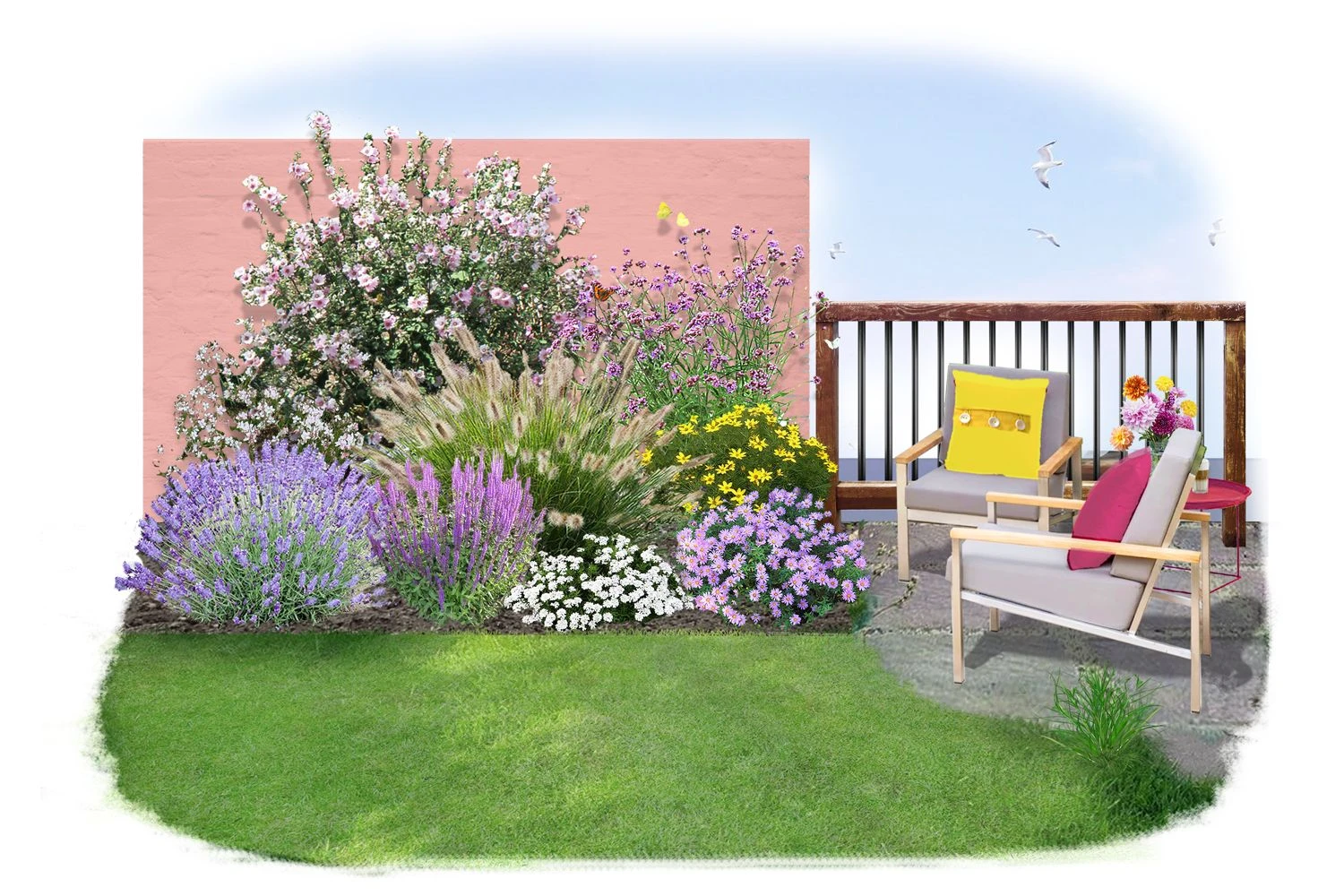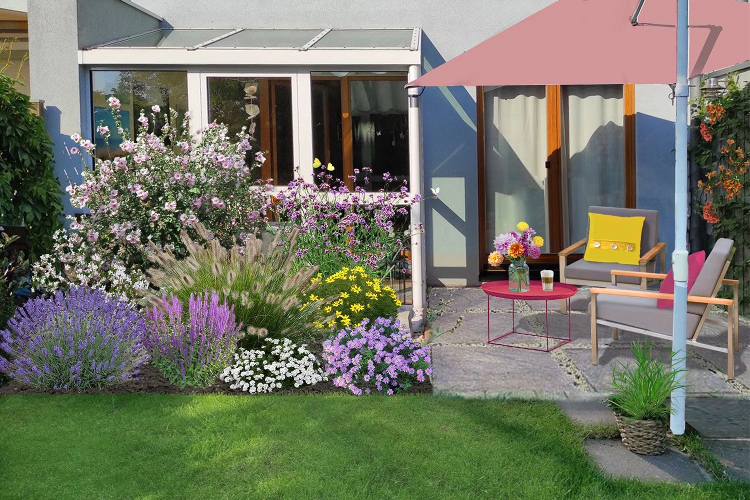 Die Beet-Idee ‘Kleines Sonnenbeet’ mit satten Blütenfarben und verschiedenen Höhen sorgt für spannende Abwechslung.