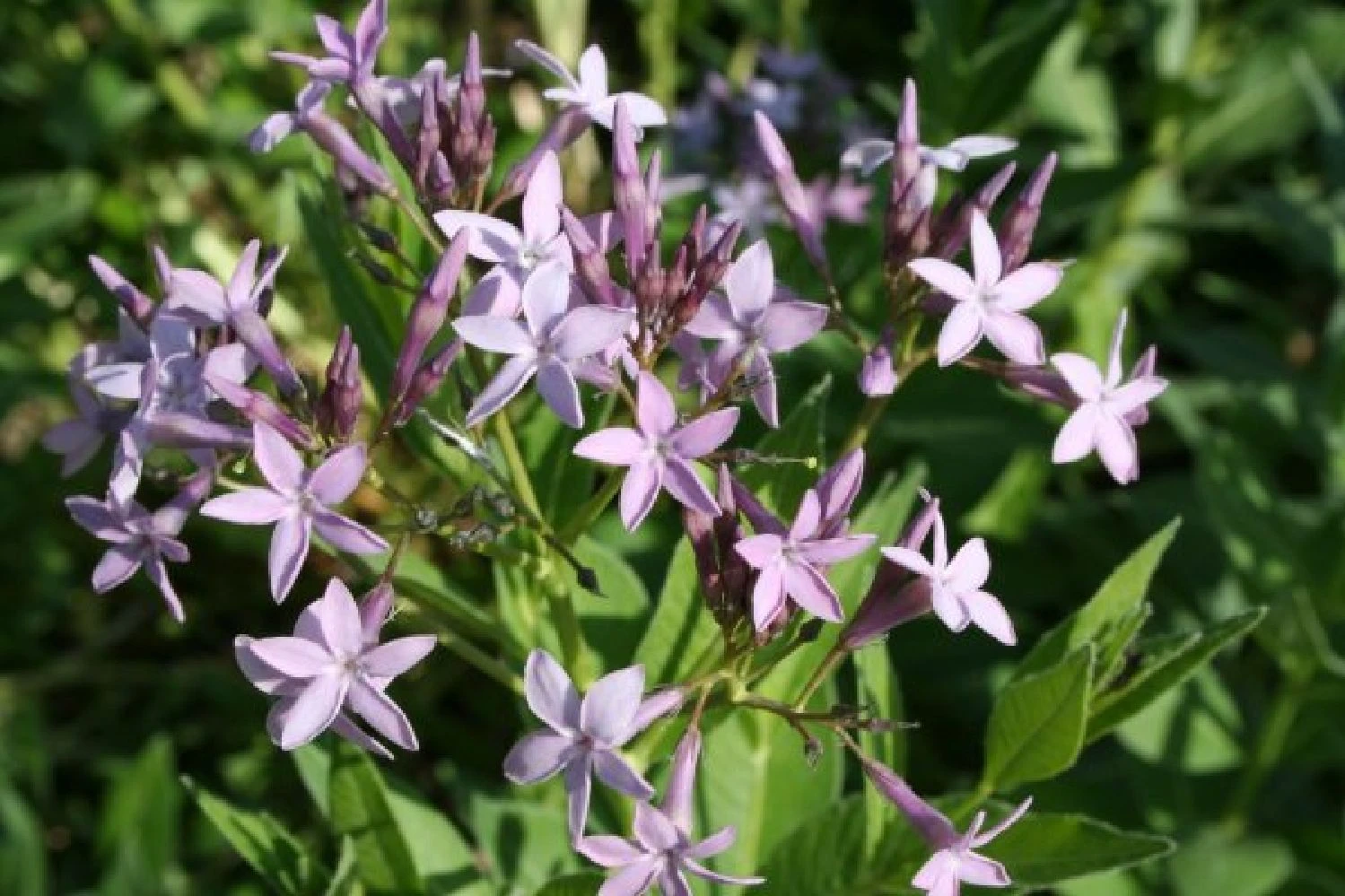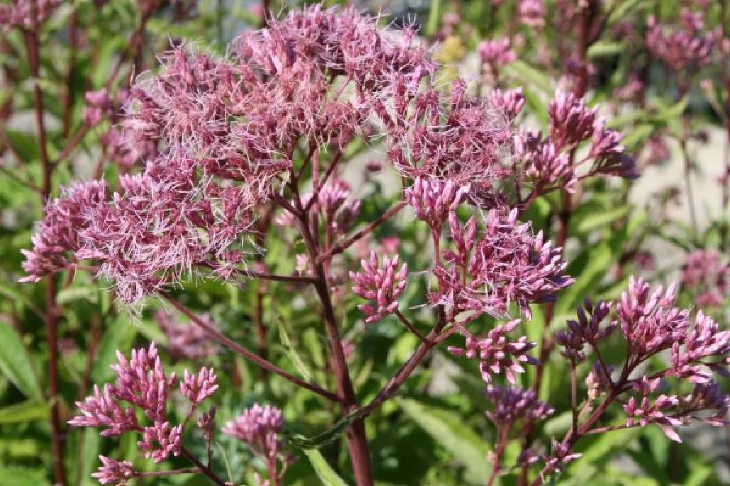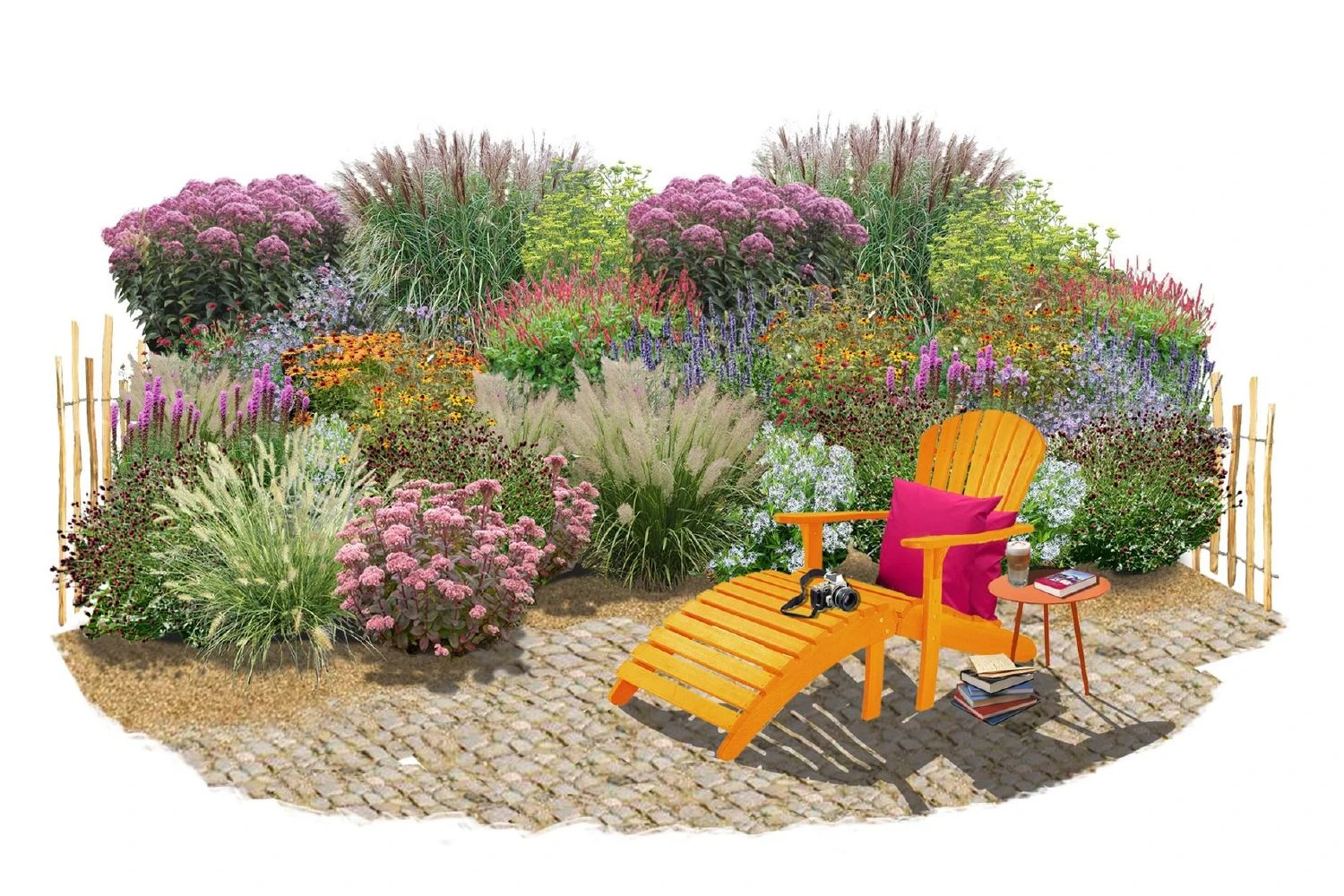 Zartlila Amsonie, leuchtstarker Scheinsonnenhut und kleiner Wiesenknopf eröffnen die Blühsaison vorm Haus. Dazu gesellen sich in rascher Abfolge Duftnessel, Kerzenknöterich, Fenchel, Knautie, Sonnenhut, Fetthenne und eine zarte Herbstaster. Kräftiger, rosa Wasserdost sorgt im Hintergrund des Beetes zusammen mit zwei herrlichen Chinaschilf für Höhe und verleiht der Pflanzung optisches Gewicht. Ab Spätsommer zeigen dann auch die kleineren Gräser wie Diamantgras und Lampenputzergras was in ihnen steckt, wenn sie ihre zarten Blütenstände präsentieren. Im Frühherbst gibt es dabei nichts Schöneres, als an einem kühlen, sonnigen Morgen die Tautropfen in diesen Gräsern funkeln zu sehen.